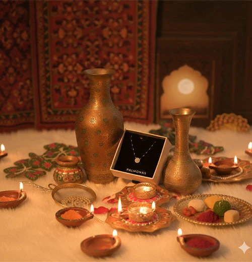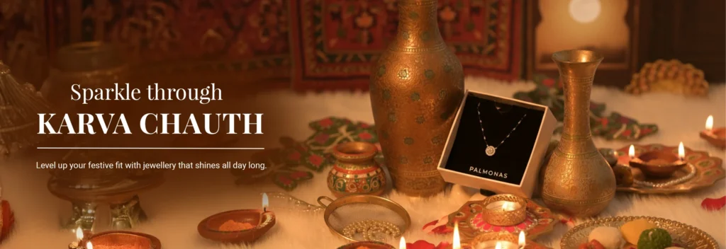 This is where Palmonas steps in. With demi fine jewellery crafted in 18k gold tones, lab grown diamonds, pearls, 925 sterling silver, surgical grade stainless steel, and finishes like rhodium plating and 18k gold plating, Palmonas redefines Karwa Chauth gifting. Think global quality, modern designs, and jewellery that actually